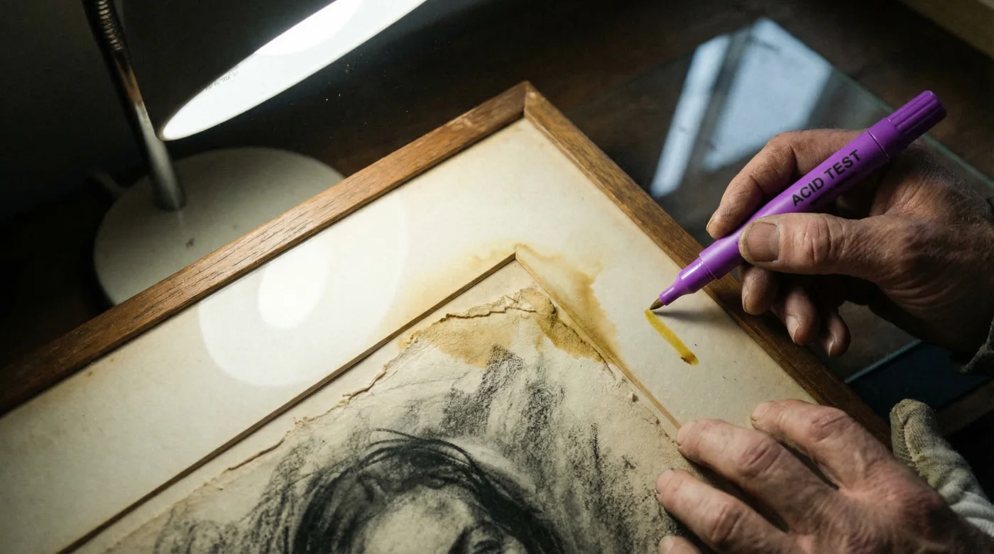 Questo nemico silenzioso si attiva a temperatura ambiente, innescando una reazione a catena che altera i pigmenti e brucia le fibre della carta, creando aloni giallastri irreversibili. La buona notizia è che esiste un’abitudine di verifica essenziale, utilizzata quotidianamente dai curatori museali, che richiede meno di due minuti e uno strumento estremamente economico per svelare la minaccia prima che sia troppo tardi. Scoprire questo segreto cambierà radicalmente il modo in cui proteggi i tuoi investimenti artistici e i tuoi ricordi di famiglia.