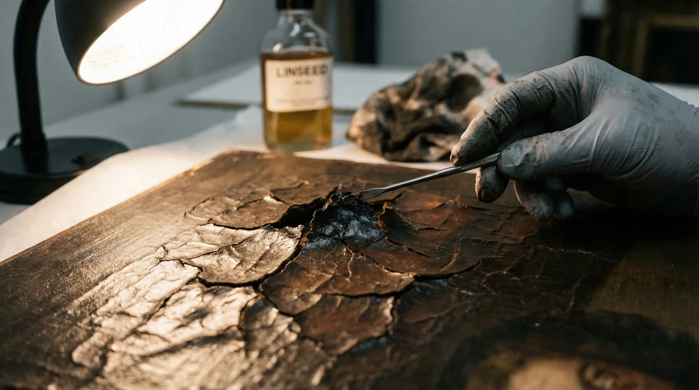 Se questo processo avviene su una tela vergine in fase di creazione, la flessibilità del supporto asseconda il movimento. Ma se l’Olio di lino fresco viene spalmato su un dipinto storico di 50 o 100 anni (dove la pittura è ormai pietrificata e priva di elasticità), la contrazione letteralmente strappa la pellicola pittorica sottostante, causando sollevamenti e cadute di colore disastrose.